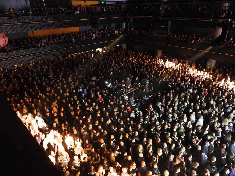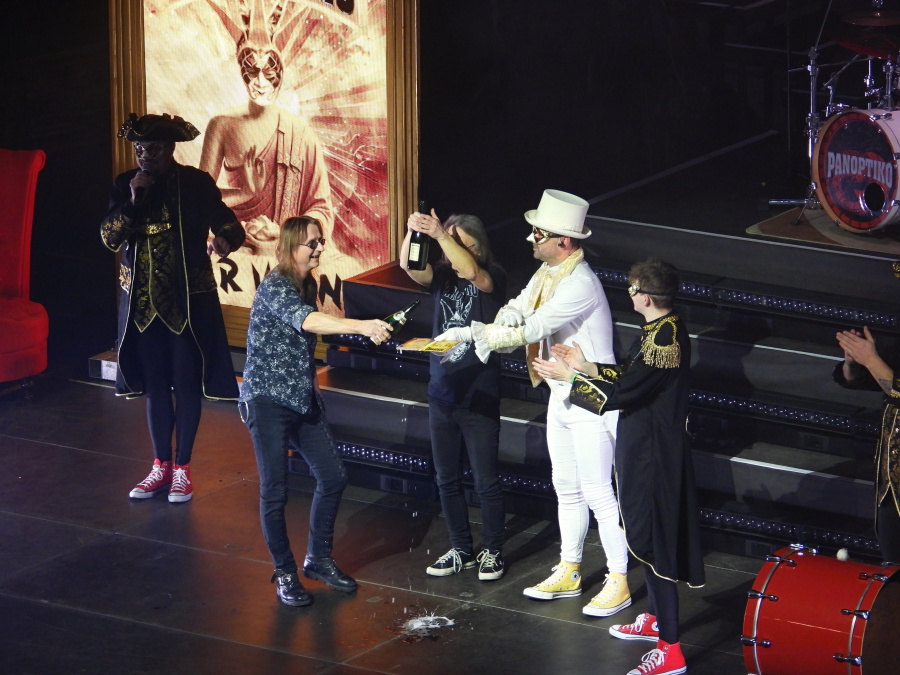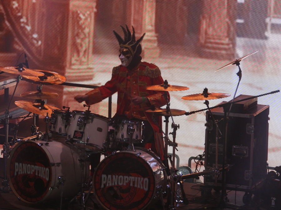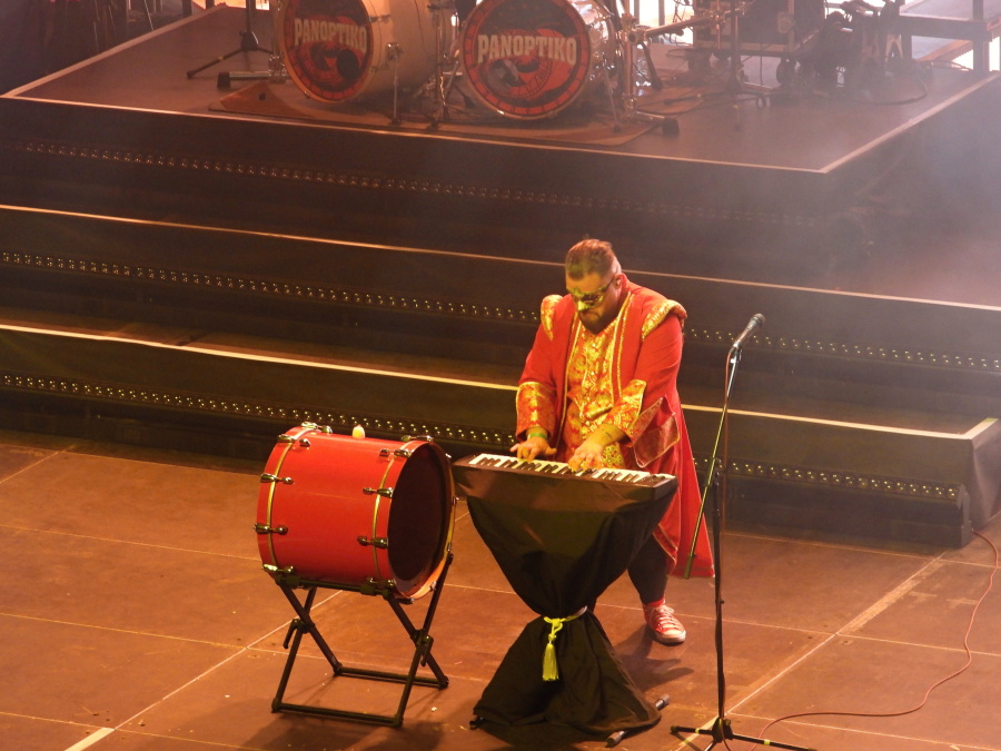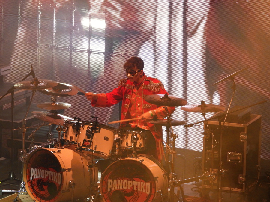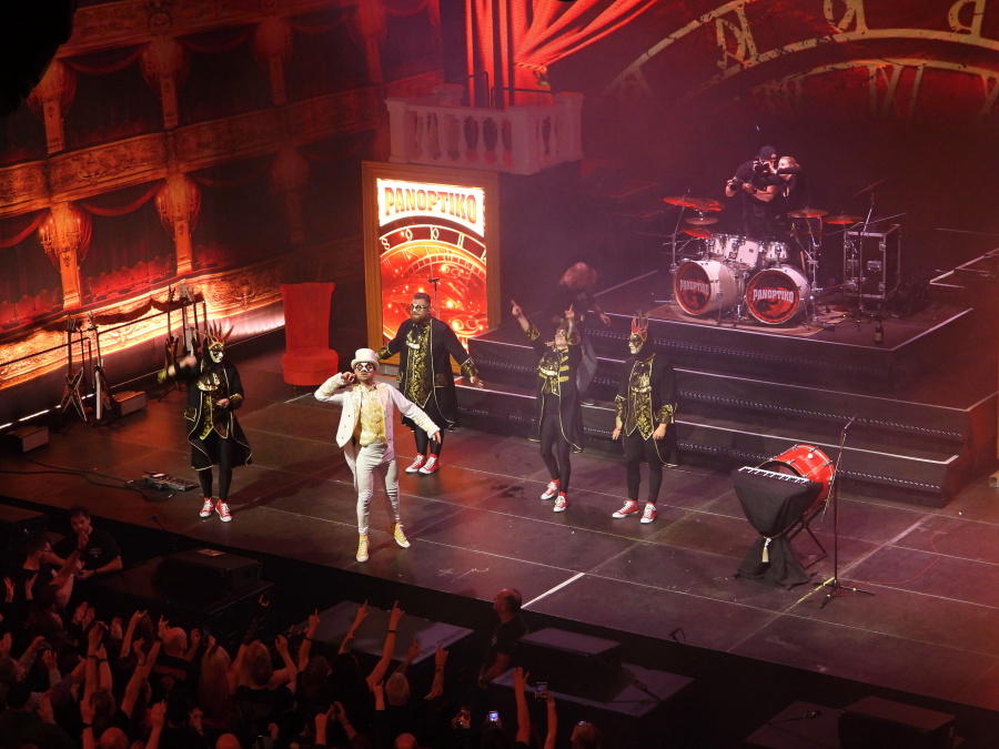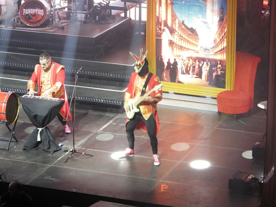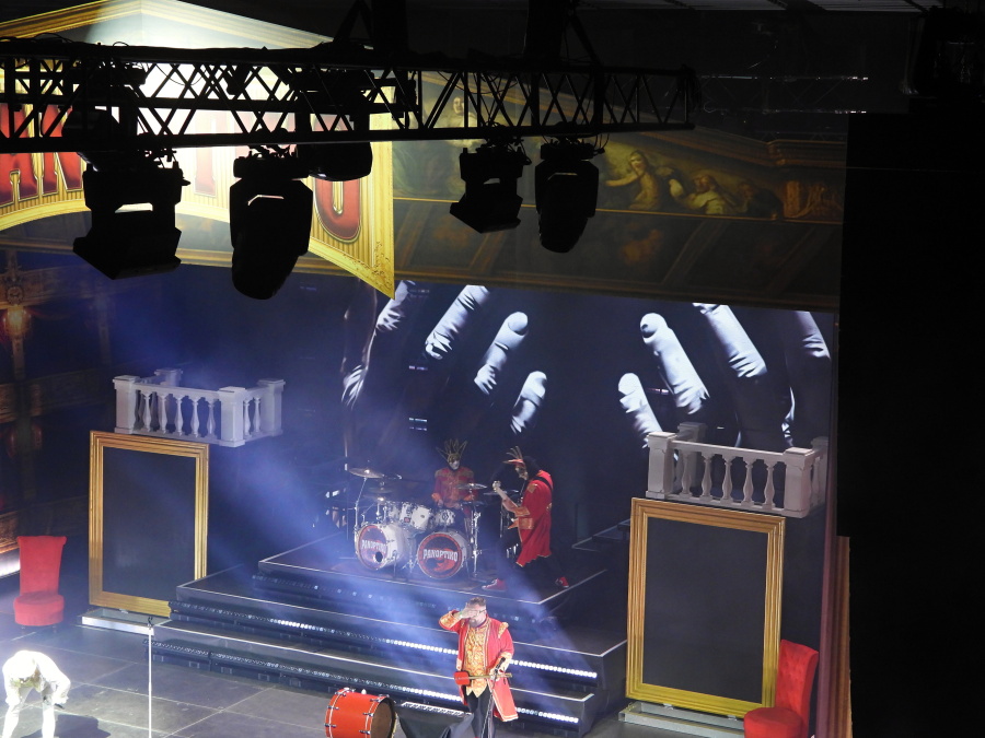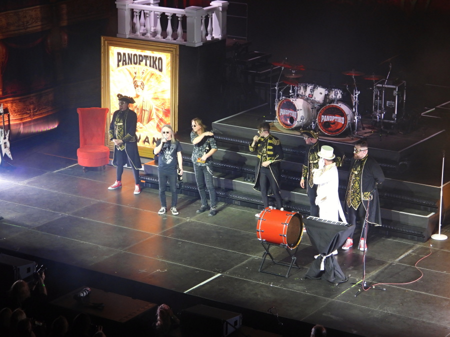 Obrovská hala se postupně plní. Stejně tak první patro. Jsme ve VIP zóně druhého patra, odkud je skvělý výhled na celé dění. Nad pódiem dominuje mohutný nápis Panoptiko, zahalený do rudé opony. Kdo zná principála kapely, ví, že tady se nic nenechává náhodě. A přesně ve dvacet hodin to přichází.