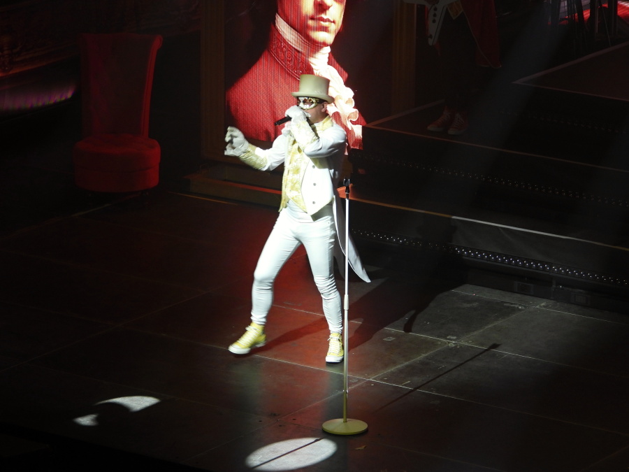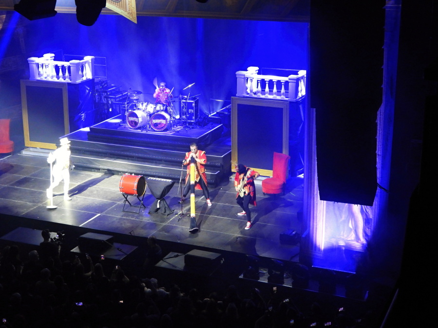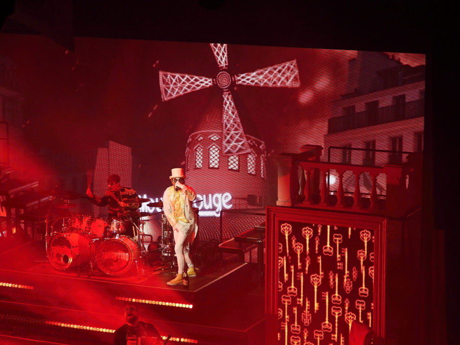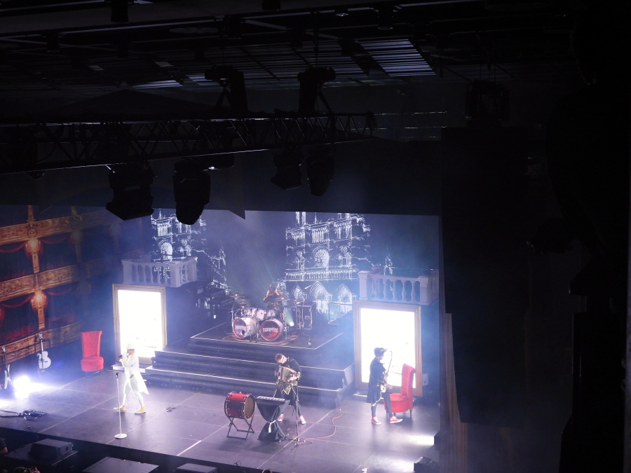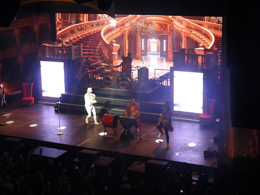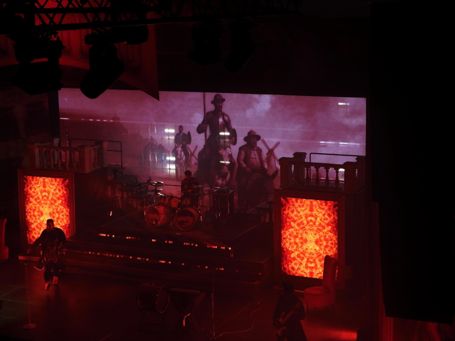 Scéna připomíná honosný operní sál. Nové, stupňovité pódium, jehož dominantou je masivní artilerie bicích. Po stranách dvě vyvýšené věže, které nejen skrývají světelné obrazovky, ale umožňují muzikantům vybíhat až na jejich vrcholy. Za bicími obrovská světelná stěna, na níž se po celý večer odvíjejí promyšlené a precizně načasované obrazové motivy.